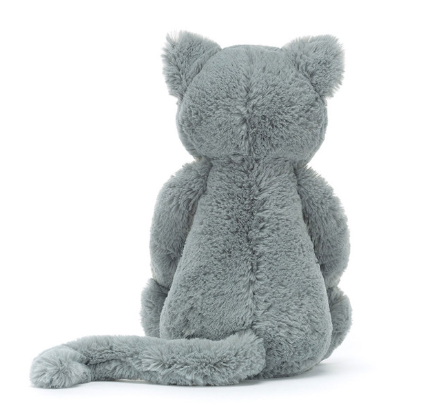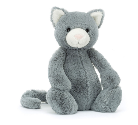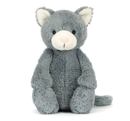 So soft and ever so pretty, Bashful Kitten is a brilliant feline friend. This dreamy cat has cloud-soft grey fur with a cream muzzle and pale pink suedette nose. With a long, curled tail and sweet, stitched smile, this kitten adds joy to every day. So soft and cuddly, it is ready to be your best friend.