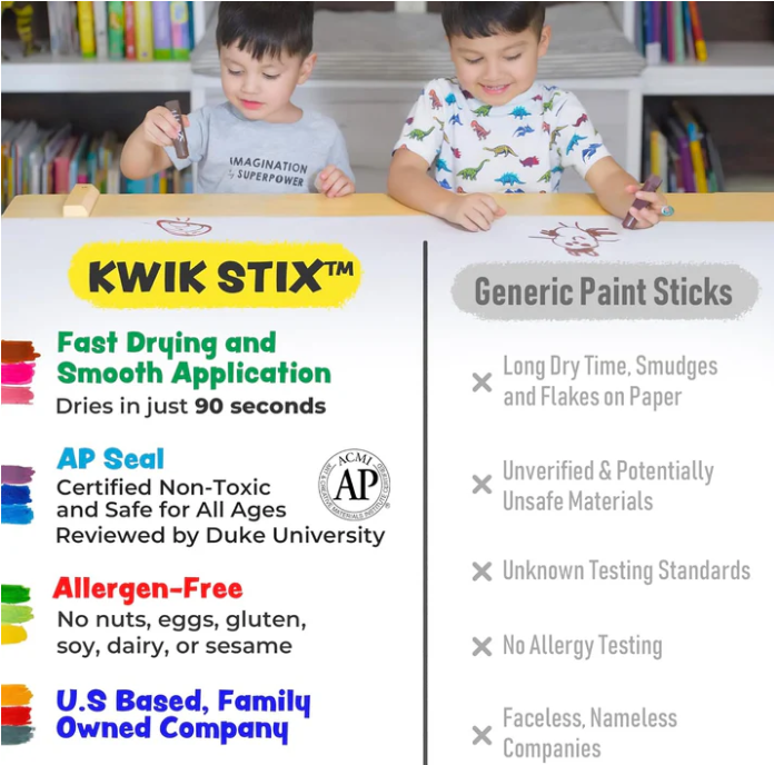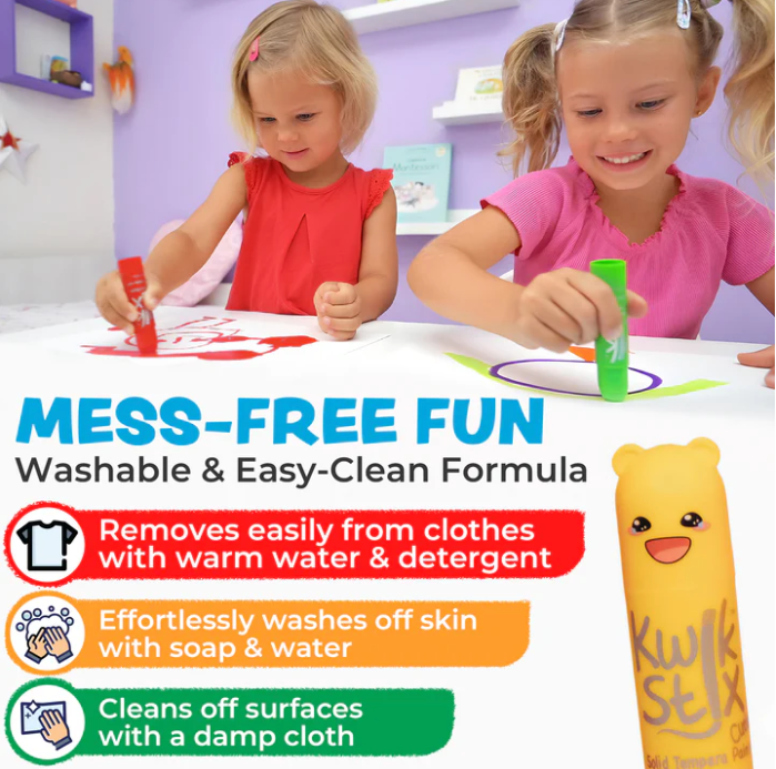 - Washable & Easy Cleanup: Kwik Stix wash off easily from hands, clothes, and surfaces, making cleanup a breeze after every creative session.