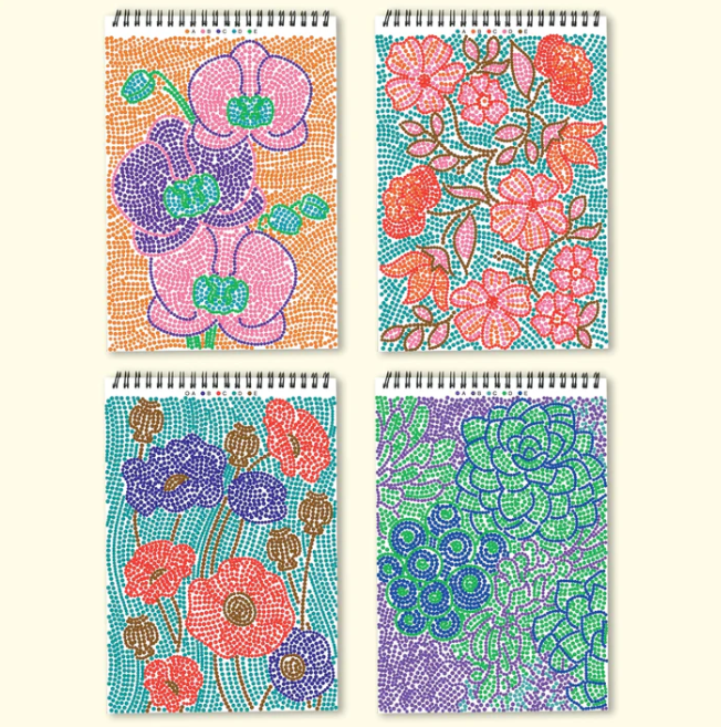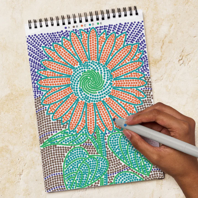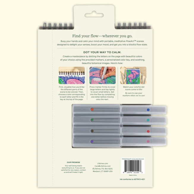 Lifelines FlowArt Pads are guided art meditations designed to help you achieve a calming flow state. Each scene is thoughtfully crafted to encourage repetitive, relaxing movements, promoting mindfulness and reducing stress. Dot-by-Letter includes 20 meditative scenes and four double-sided markers in a detachable storage tray. Engage in a meditative dotting activity using a guided letter key to fill the page with vibrant dots, creating beautiful botanical scenes. Simply match the colors to the letters, and let the rhythmic motion of dotting bring you a sense of calm. Compact and portable, this pad is perfect for calming your mind on-the-go, unwinding before bed, or taking a work or study break to de-stress. Stop the scrolling and focus on mindfulness with this coloring activity. Easy to take with you.