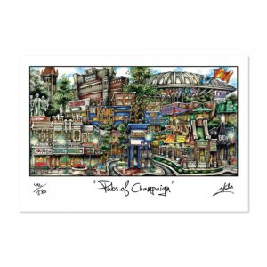 18” x 24” Poster version of hand painted image of the iconic “pubs” and landmarks in the town of Champaign, IL surrounding University Of Illinois. Available framed or unframed.
